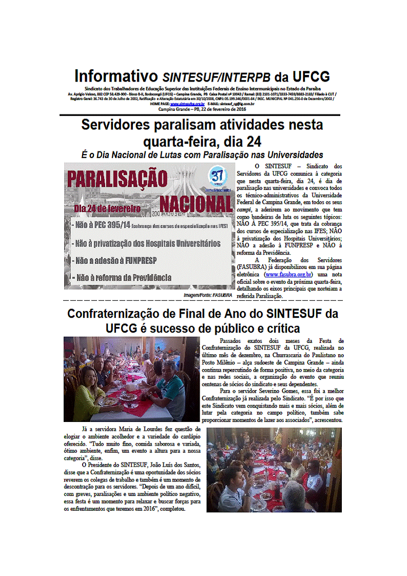 Decisão foi aprovada por unanimidade em Assembleia Geral da categoria Os técnico-administrativos da Universidade Federal de Campina Grande, em Assembleia Geral promovida pelo SINTESUF – Sindicato dos Servidores da UFCG, realizada na manhã de hoje, no auditório do Centro de Humanidades – campus Campina Grande – decidiram, por unanimidade, aderir ao Dia Nacional de Lutas, […]
