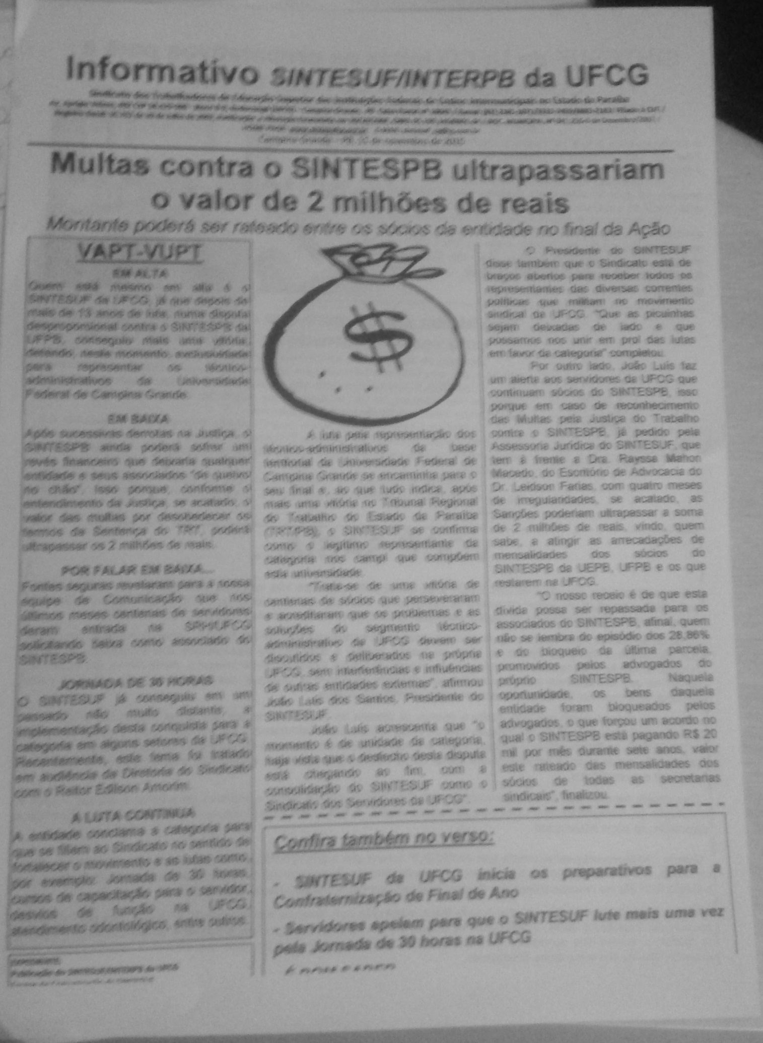 O Sindicato dos Servidores da UFCG (SINTESUF/INTERPB) foi a opção escolhida pela aluna Vanda Balbino, do Curso de Bacharelado em Comunicação Social da Universidade Federal de Campina Grande, para a realização de uma atividade da disciplina "Práticas Educomunicativas em Editoração", ministrada pela professora Afonsina Rezende, no semestre letivo 2015.1. "A princípio a proposta […]